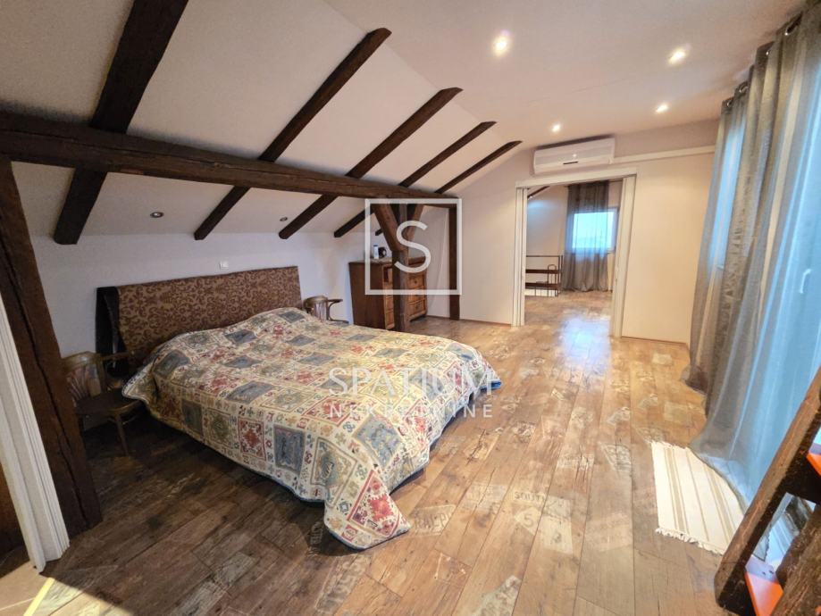 Iz jedne spavaće sobe vode stepenice u visoko potkrovlje, gdje se nalazi ugodan i funkcionalan prostor sa spavaćom i dnevnom sobom, kupaonicom te velikom terasom s otvorenim pogledom na more.