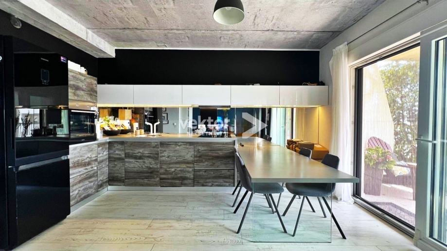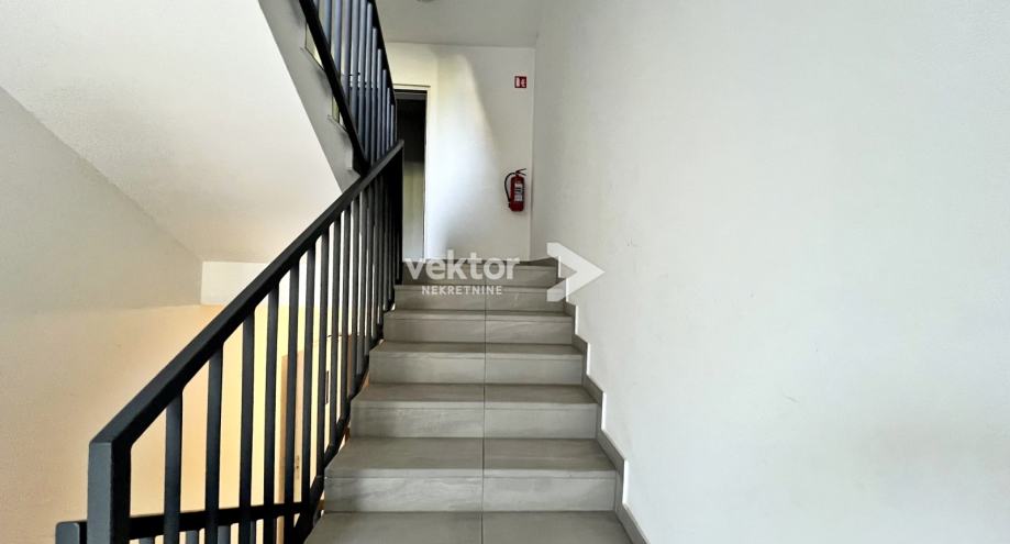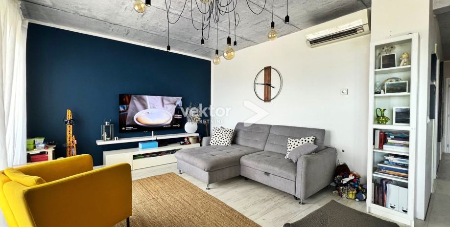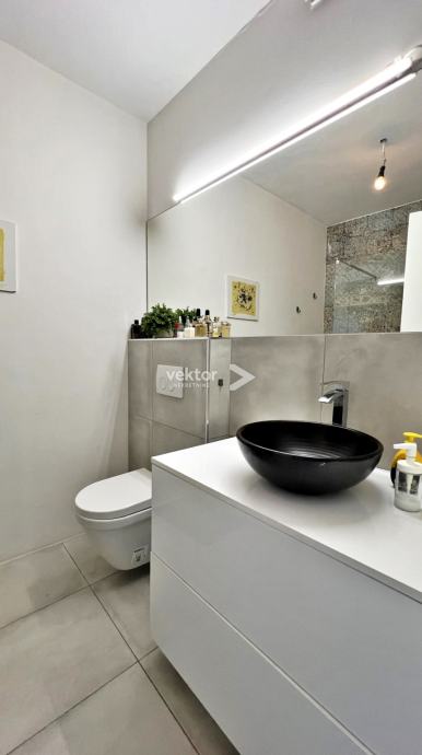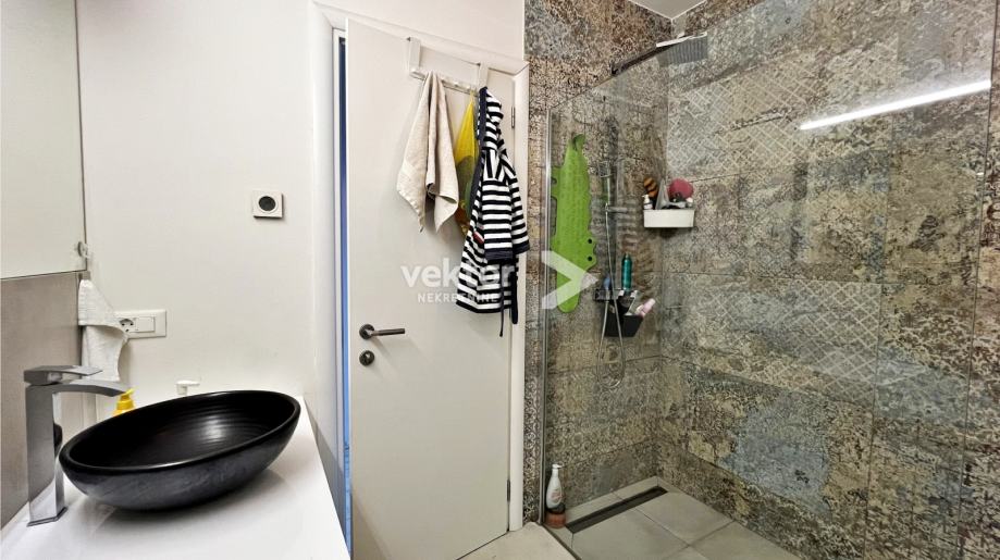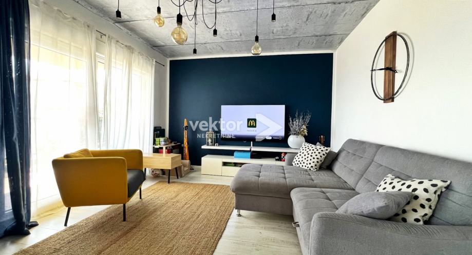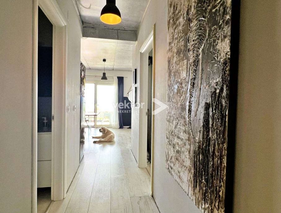 Interijer je uređen suvremeno i s pažnjom na detalje: PVC troslojna stolarija, podno grijanje na struju, klima uređaji za dodatnu udobnost, te kvalitetni drveni podovi („seljački pod“) koji prostoru daju toplinu i karakter. Stan se prodaje potpuno namješten, što budućim vlasnicima omogućuje useljenje bez dodatnih ulaganja.