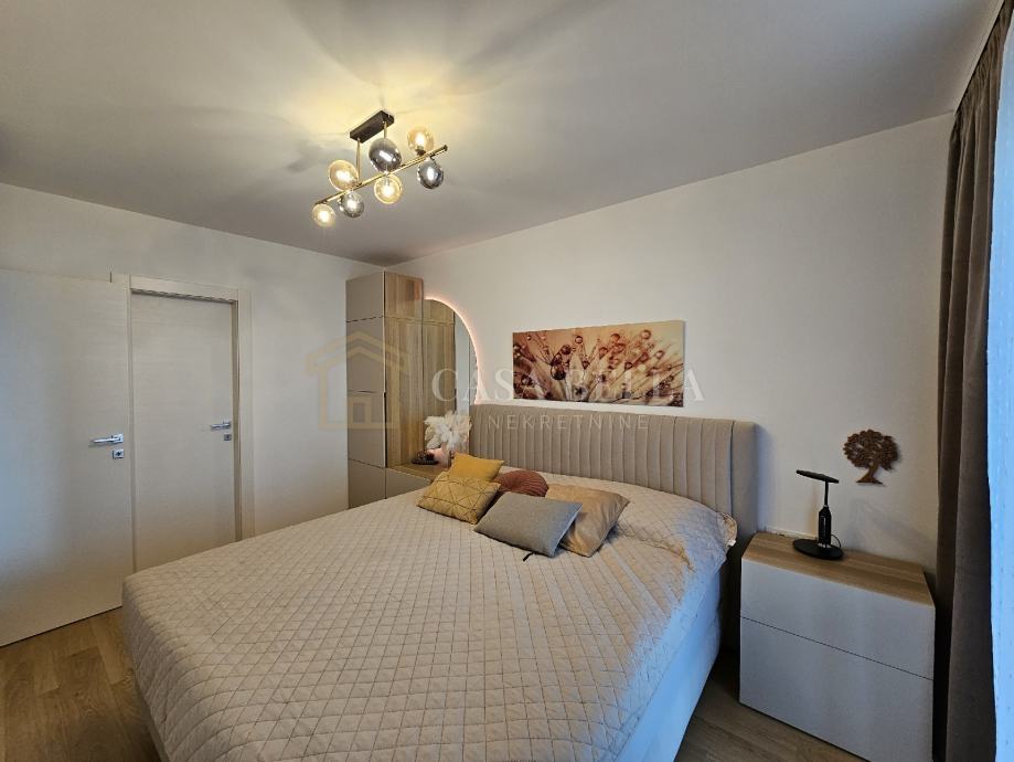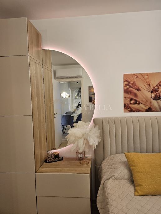 Stan se nalazi na 3. i posljednjem katu novogradnje s liftom. Jako lijepo uređen i potpuno opremljen, stan se sastoji od dvije spavaće sobe, dnevnog boravka, kuhinje s blagovaonicom, kupaonice, balkona na koji se može izaći iz dnevnog boravka i jedne od spavaćih soba, te ostave.