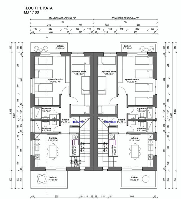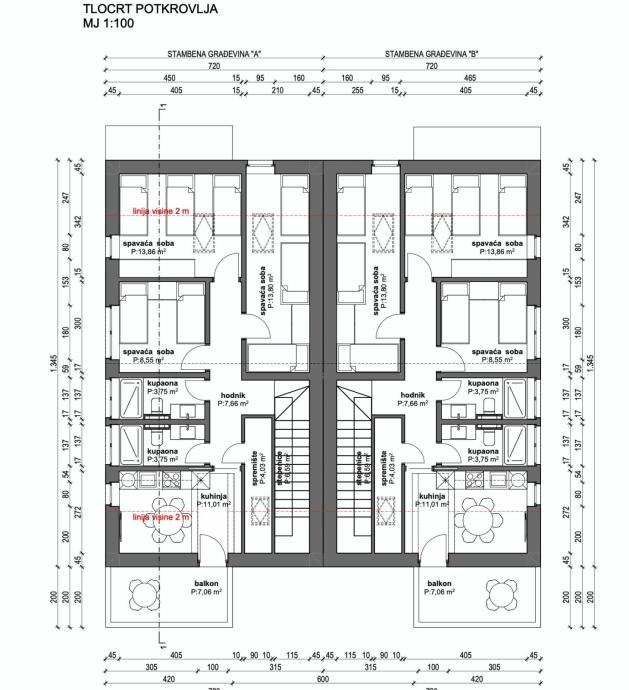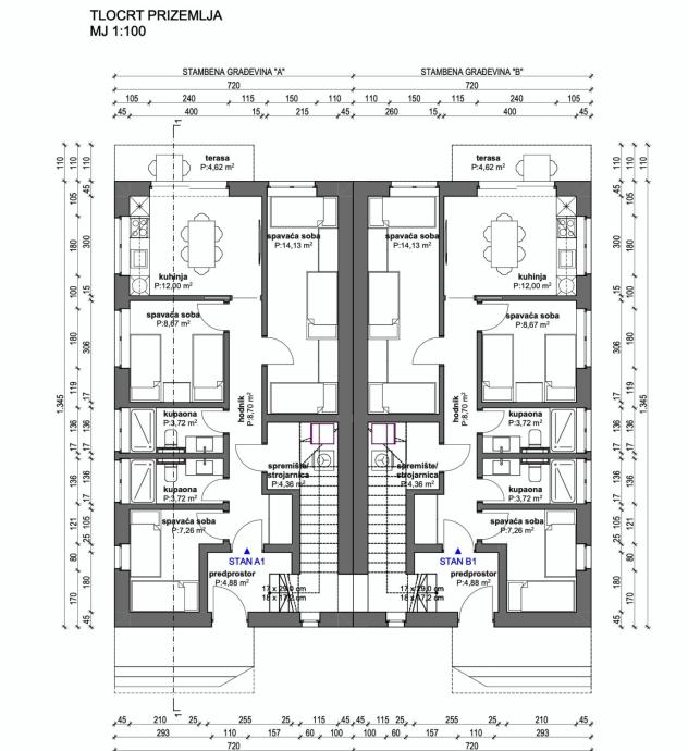 Prizemlje svakog objekta sadrži jednosoban stan površine 65 m2 neto, dok su na prvom katu i potkrovlju smješteni dvoetažni stanovi površine 145 m2 neto. Takav raspored pruža optimalnu privatnost i prostor za svaku jedinicu.