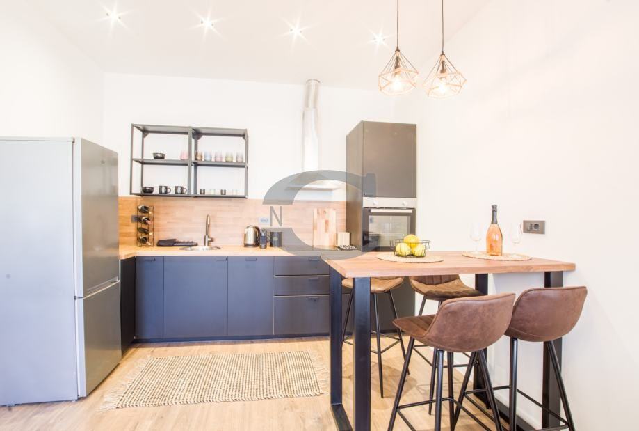 Atraktivno novouređen i novonamješten jednosobni stan s kojeg se pruža pogled i na more.