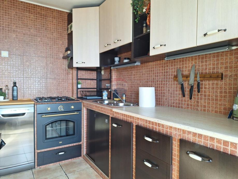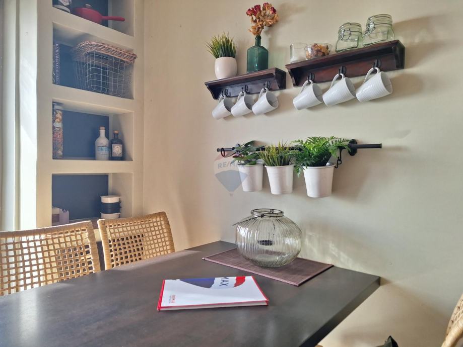 Nalazi se na trećem katu zgrade smještene u mirnoj ulici s prekrasnim panoramskim pogledom na Kvarner. Stan je južne orijentacije, osunčan, iznimno šarmantan i jedinstven.