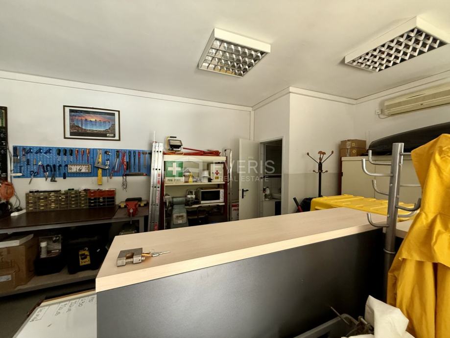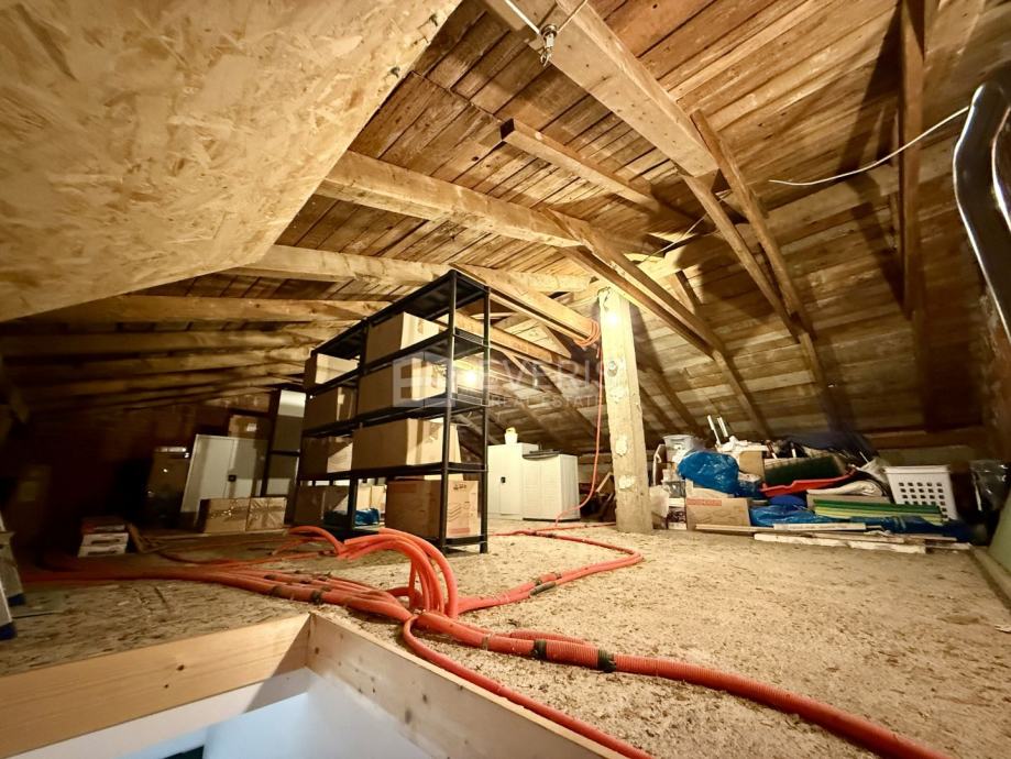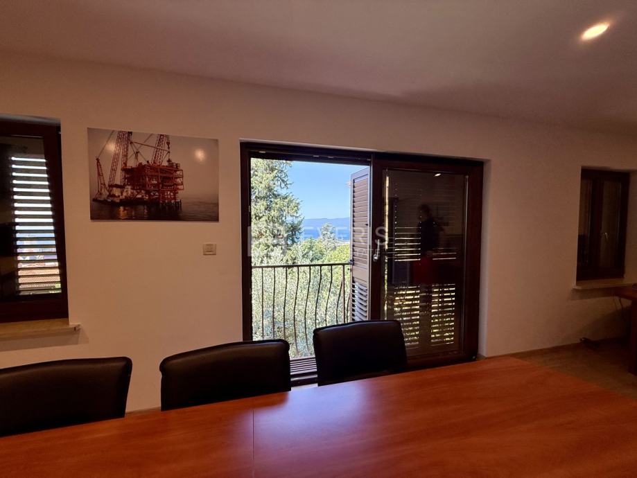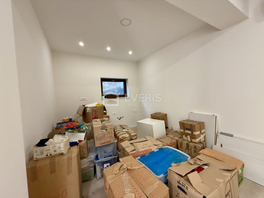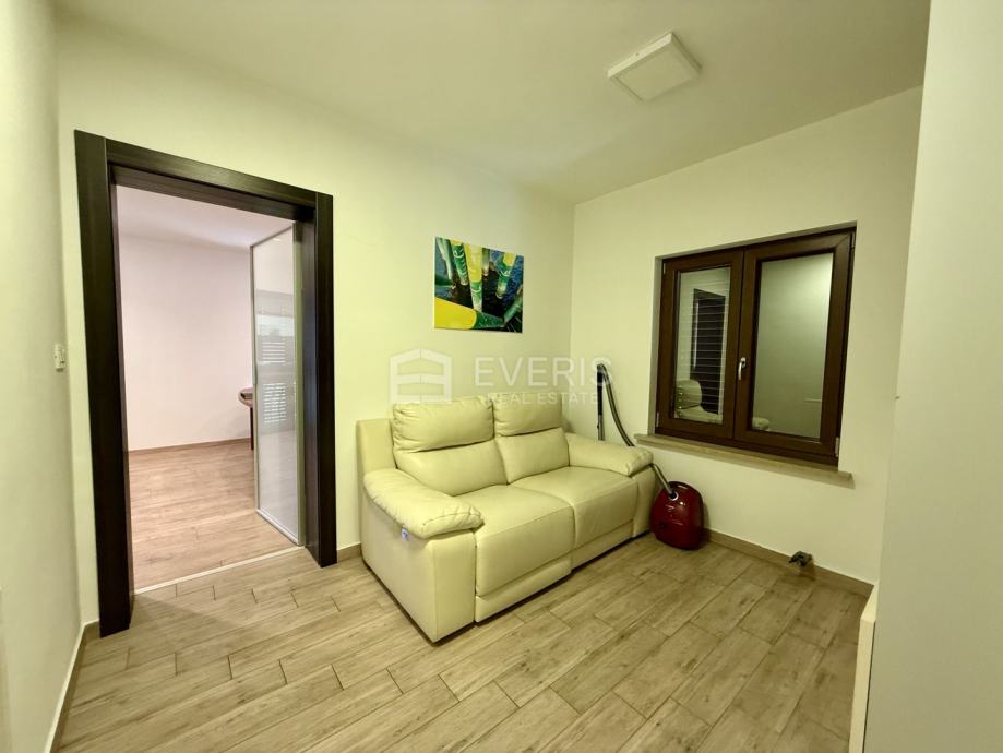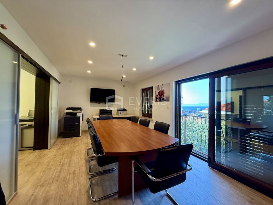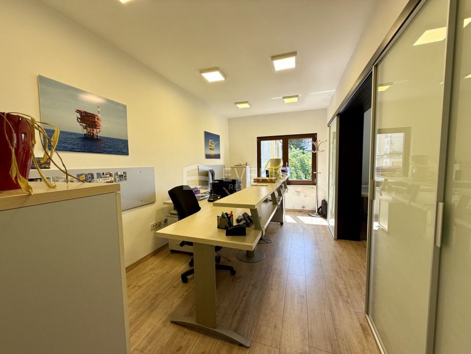 Prvi kat, 100 m2; trenutno je koncipiran kao poslovni prostor koji je kompletno adaptiran, s PVC stolarijom, tri inverter klima uređaja, te pripremom za podno grijanje na struju i pripremom za centralno grijanje (radijatori nisu montirani). Stan se uz malo mašte može pretvoriti u prostrani dvosobni stan s dnevnim boravkom, pogledom na more. U stanu su montirane stepenice koje vode u prostrano potkrovlje, iskoristive površine od 80 m2, koje je trenutno u rohbau fazi.