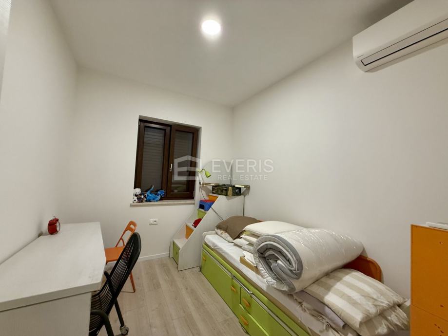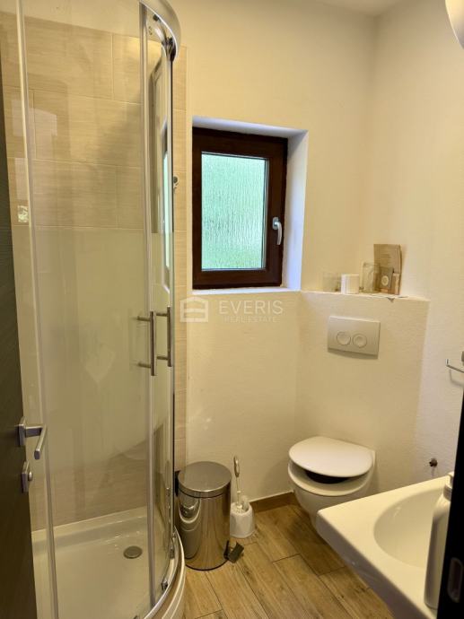 Prizemlje, 100 m2; dvosobni stan s dnevnim boravkom, kupaonom i kuhinjom iz koje se izlazi direktno na okućnicu. U stanu je montiran inverter klima uređaj.