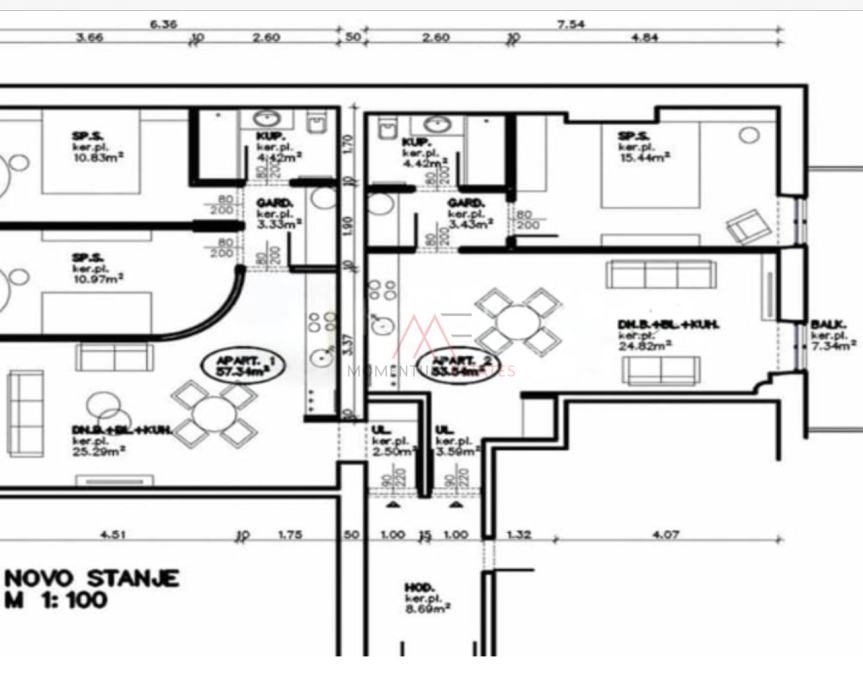 Posredujemo u prodaji dva stana površine 58m2 i 54m2 adaptacijom nastalih od većeg stana ukupne površine 112m2.