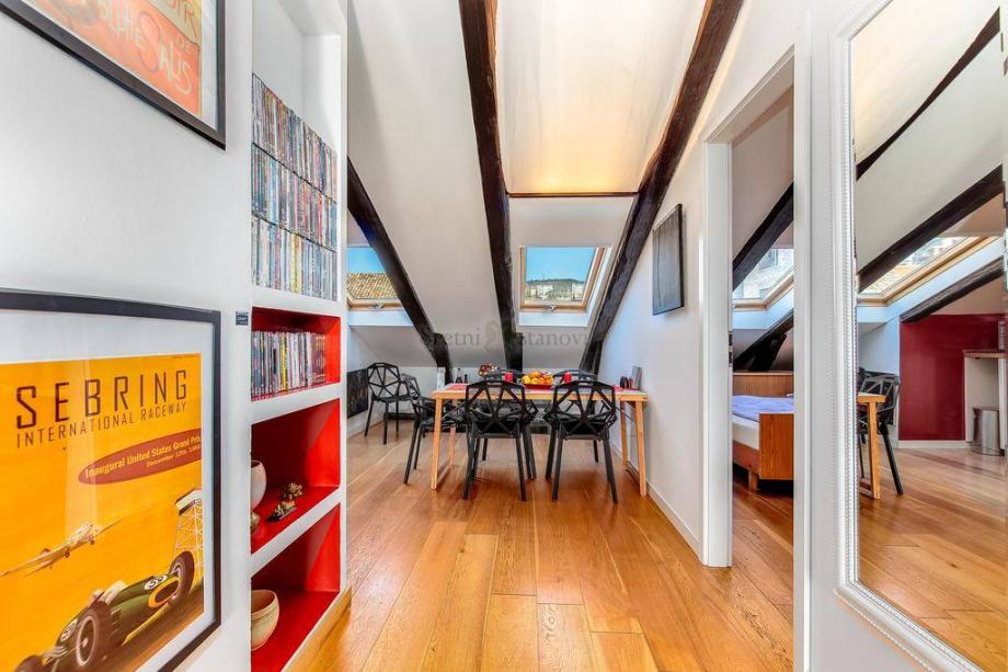 Predivan mansardni, moderni stan u strogom centru grada. Uređen sa stilom, ima dvije spavaće sobe, kuhinju s blagovaonom, veliki otvoreni dnevni boravak , radni dio, balkon s izuzetnim pogledom, kupaonu i garderobu. Moderno je opremljen i atraktivno namješten. Ostava je u prizemlju zgrade. Grijanje na klima uređaje. Stan je odlična investicija, prikladan za kratkoročni ( dnevni ) ili dugoročni najam, jer kao takav i djeluje na tržištu, a njaviše ga vole mladi ljudi i oni koji traže osebujno uređene stanove i privatnost. Stan je etažiran i ima uredan vlasnički list.