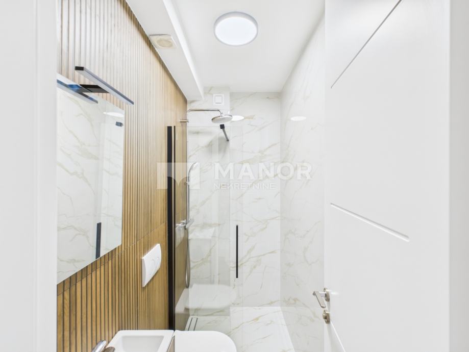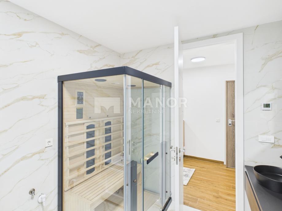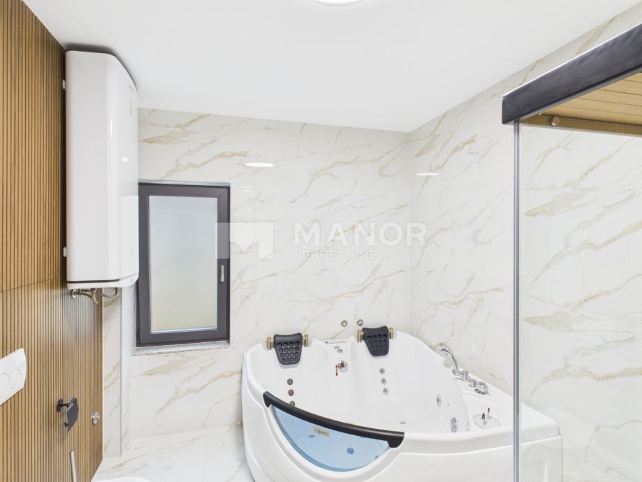 Kupaonica je dodatno opremljena saunom i jacuzzijem, čime stan dobiva luksuznu notu.