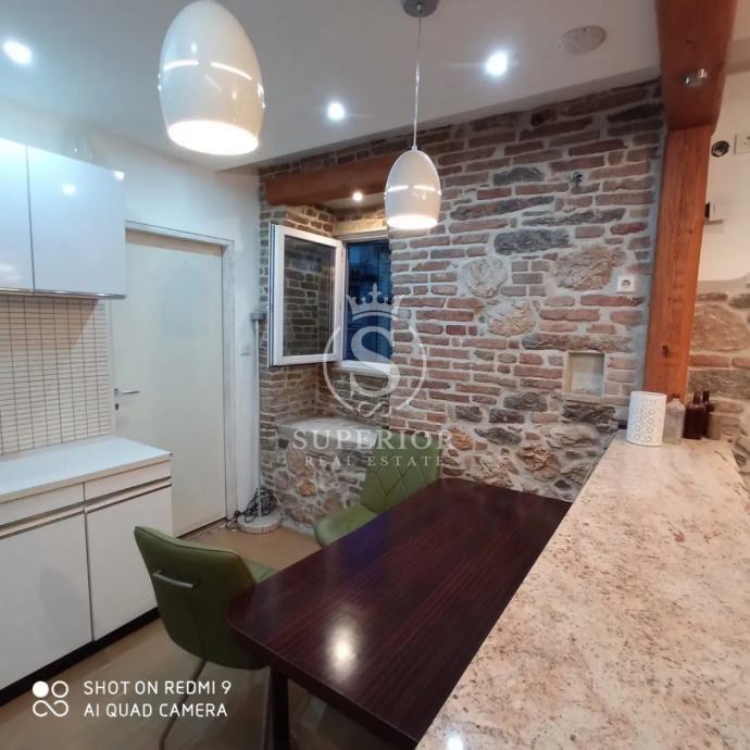 Posebnu atmosferu daju originalni kamen i cigla, stručno obrađeni i očuvani, kao i šank obložen novim Shivakashi mramorom – detalj koji prostoru daje karakter i čini ga iznimno atraktivnim za Airbnb koncept ili kvalitetan dugoročni najam.