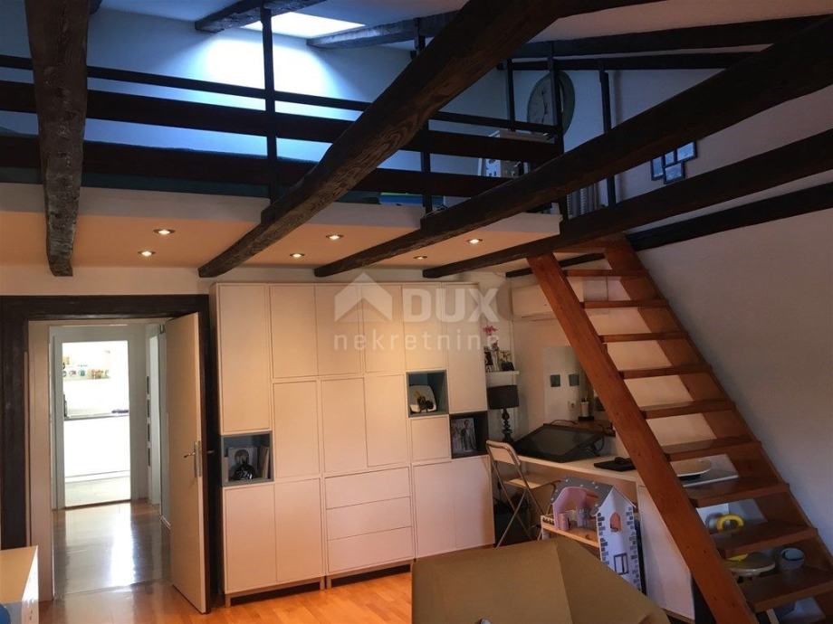 Prodaje se stan na 4. katu u srcu Rijeke. Nalazi se u visokom potkrovlju gospodske zgrade. Sastoji se od jedne spavaće sobe iz koje se izlazi na intimnu terasu, velikog dnevnog boravka s galerijom na kojoj se nalazi dodatni krevet, kuhinje, kupaonice i prostranog hodnika. Stan je u potpunosti adaptiran te se prodaje namješten. Iako je stan jednosobni, dodatna soba se može iskoristiti na spomenutoj galeriji. Visina galerije adekvatna je za spavaći dio ili dječju zonu.