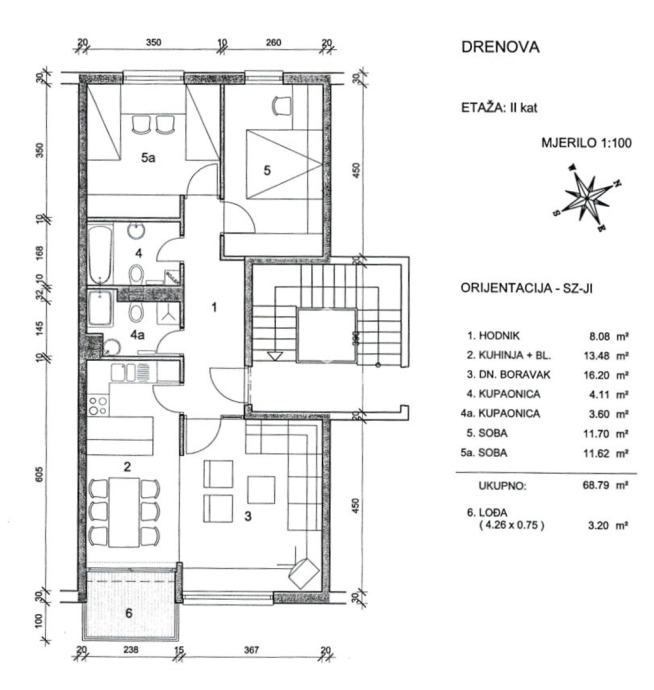 - Raspored: 2S+DB, dvije kupaonice, balkon, ugradbeni ormar u hodniku