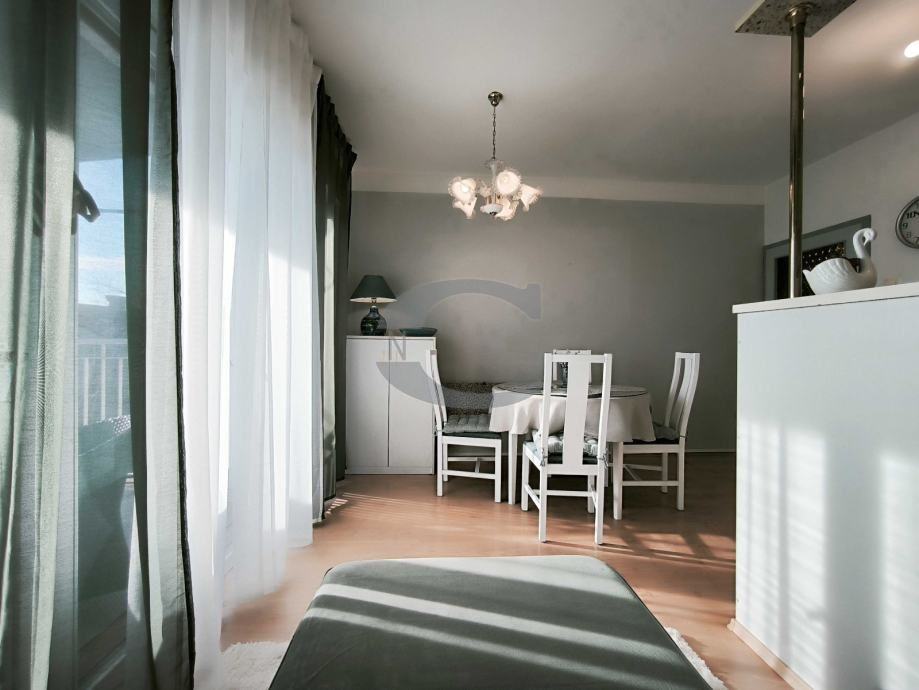 Stan se sastoji od dvije velike sobe, dnevnog dijela, kupaonice, spremišta te velikog balkona s pogledom na more.