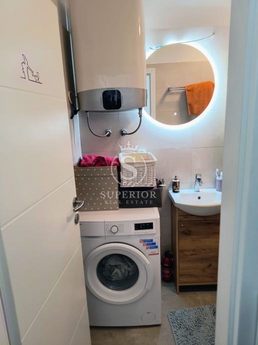 Stan se sastoji od moderne kuhinje spojene s dnevnim boravkom i blagovaonicom, iz koje se izlazi na zatvorenu lođu s pogledom na more, spavaće sobe s balkonom te moderne kupaonice s tušem. Uz stan dolazi i spremište površine 7 m2. Parking se nalazi u okrugu zgrade.