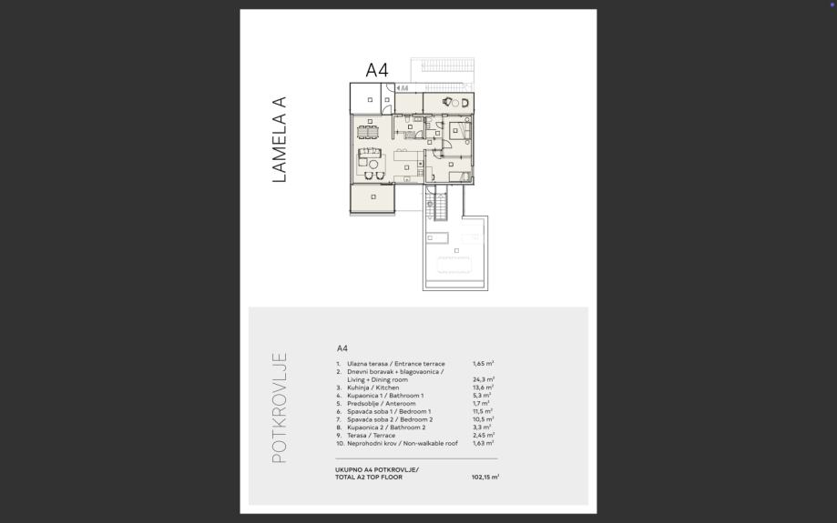 Rijeka Dubrovačka, Projekt Orange Garden, novogradnja, stan A4 ukupne netto površine 102,15 m2.Stan penthouse se nalazi na vrhu manje stambene zgrade, stan se sastoji od ulazne terase, hodnika, dvije spavaće sobe od kojih jedna ima vlastitu kupaonicu, zasebne kupaonice te kuhinje s dnevnim...Za ovu nekretninu kontaktirajte agenta na broj telefona +385 91 612 6121.Više na Eurovilla.hr, ID: 334177Direktan link: https://eurovilla.hr/nekretnina/rijeka-dubrovacka-orange-garden-stan-a4-102-15-m2/334177/-----Rijeka Dubrovačka, Orange Garden Project, new development, Apartment A4 with a total net area of 102.15 m².The penthouse apartment is located on the top floor of a smaller residential building and consists of an entrance terrace, hallway, two bedrooms (one of which has an en-suite bathroom), a... For this property contact our agent on telephone number +385 91 612 6121.More on Eurovilla.hr, ID: 334177Direct link: https://eurovilla.hr/en/property/rijeka-dubrovacka-orange-garden-apartment-a4-102-15-m2/334177/...