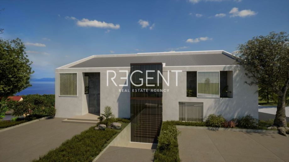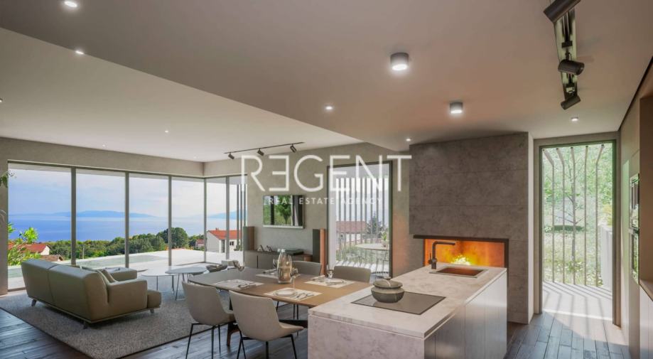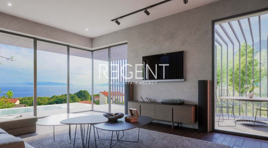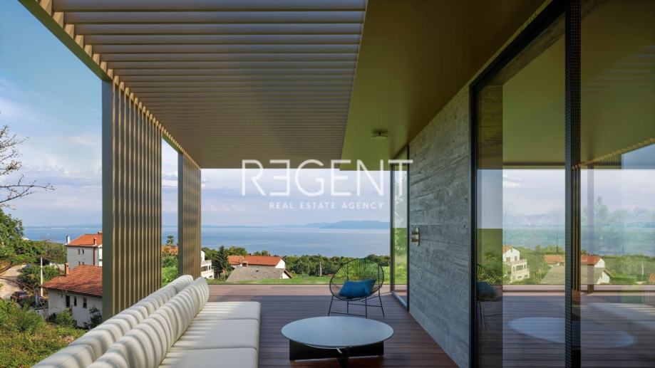 U mirnom naselju udaljenom 10-ak minuta od Opatije i 15 min od centra Rijeke u luksuznom stambenom kompleksu smjestio se dvoetažni stan, stan je smješten u prizemlju stambene zgrade ukupne površine 180 m2. Stan se sastoji od dvije etaže: Prizemlja: u kojem se nalazi otvoreni dnevni boravak sa blagovaonicom i kuhinjom, toalet, praonica i ostava. Dnevni boravak je od vanjskog dijela odvojen velikom kutnom staklenom stijenom sa pragovima u ravnini poda na podizno klizni sistem otvaranja. Kada je staklena otvorena dobiva se jedinstveni prostor koji objedinjuje dnevni boravak i blagovaonu sa vanjskom terasom koja je natkrivena velikom pergolom, sunčalištem sa završnom oblogom od deckinga i bazenom.