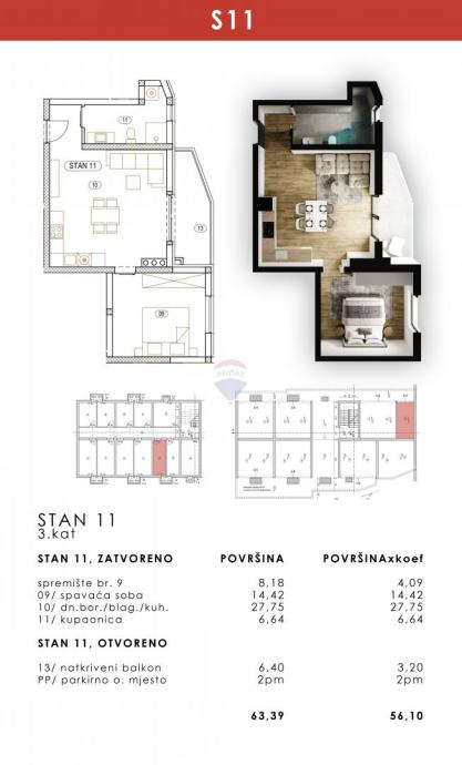 Stan 11, sveukupne površine sa koeficijentima 56.10 m2, nalazi se na 3. katu, a sastoji se od: 1 spavaće sobe, dnevnog boravka s kuhinjom i blagovaonom, kupaone, pretprostora i balkona s pogledom na more.