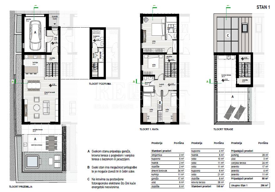 Stan je raspoređen na tri etaže : podrum, prizemlje i prvi kat.