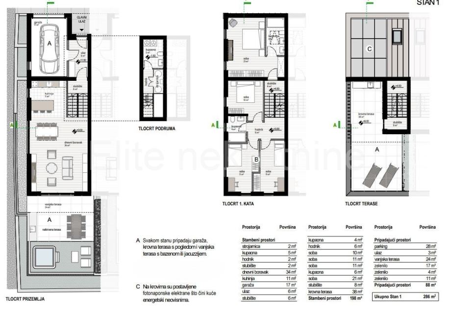 Garaža i parking Uključena je privatna garaža s dodatna dva parkirna mjesta, te priprema za punjenje električnih vozila u garaži i na vanjskom parkingu.