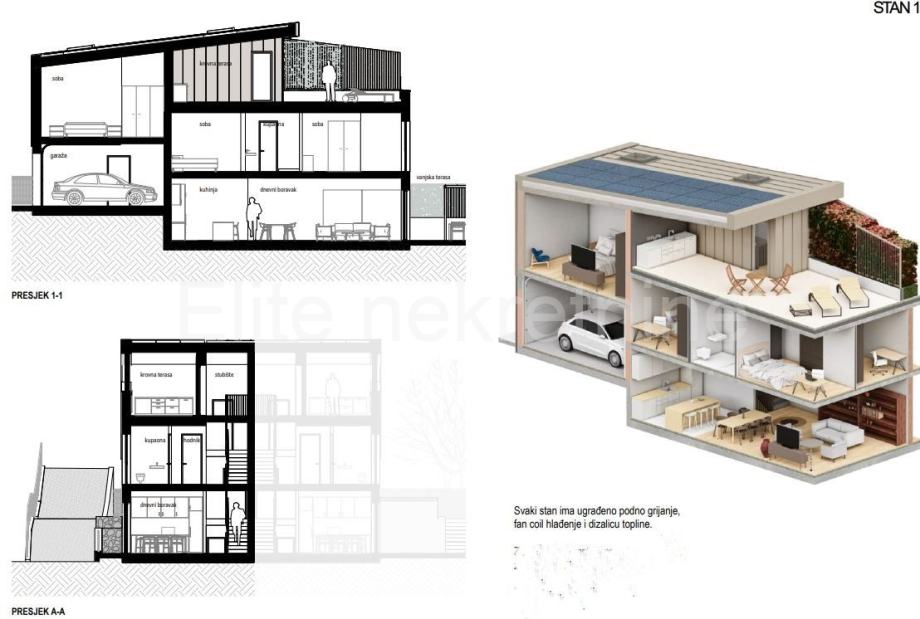 Niskoenergetski koncept Stan je dio modernog kompleksa opremljenog solarnim elektranama, čime se osigurava energetska neovisnost i minimalni mjesečni troškovi. Uključene su i dizalice topline za grijanje i hlađenje te priprema za grijanje bazena i ostalih sustava.