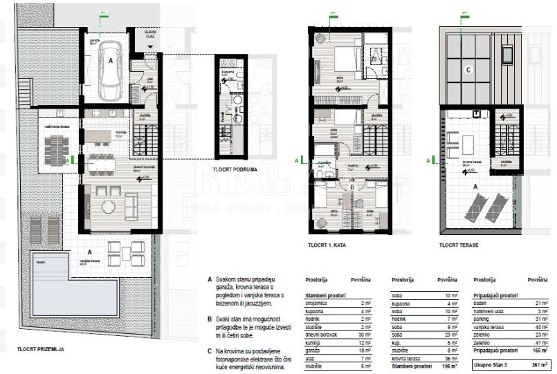 U prodaju smo dobili luksuzan stan u novoj zgradi na Kostreni, točnije u Svetoj Luciji čija površina obuhvaća 196 m2 stambenog prostora, te 165m2 vanjskog prostora. Stan se proteže se na tri etaže: podrum, prizemlje i prvi kat. U prizemlju se nalazi prostrani dnevni boravak, kuhinja, te privlačna vanjska terasa s bazenom. Podrum sadrži kupaonicu i kotlovnicu. Na prvom katu se nalaze četiri spavaće sobe i dodatna kupaonica. Izlazak na krovnu terasu s nevjerojatnim panoramskim pogledom na more omogućen je s prvog kata. Stan je opremljen podnim grijanjem, fan coil hlađenjem i dizalicom topline. Kupci imaju slobodu odabira završnih materijala prema vlastitim preferencijama. Na krovu su instalirane fotonaponske elektrane, što kuću čini energetski neovisnom. Objekt se nalazi u popularnom dijelu Kostrene, poznatom kao "Zelena Kostrena", udaljenom samo 5 minuta vožnje do prve plaže. Pristup objektu je omogućen s gornje ceste, gdje se planira proširenje postojeće prometnice. Stan dolazi s dva vanjska parkirna mjesta i garažom unutar zgrade. Za sve dodatne informacije o ovoj izuzetnoj ponudi, slobodno nas kontaktirajte.