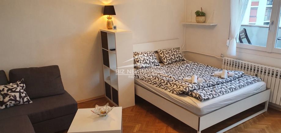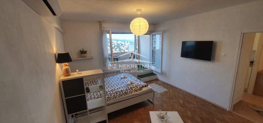 Iznajmljuje se potpuno uređen i opremljen stan od 40 m2 na 15. katu zgrade s dva lifta, s prekrasnim pogledom na cijeli grad.