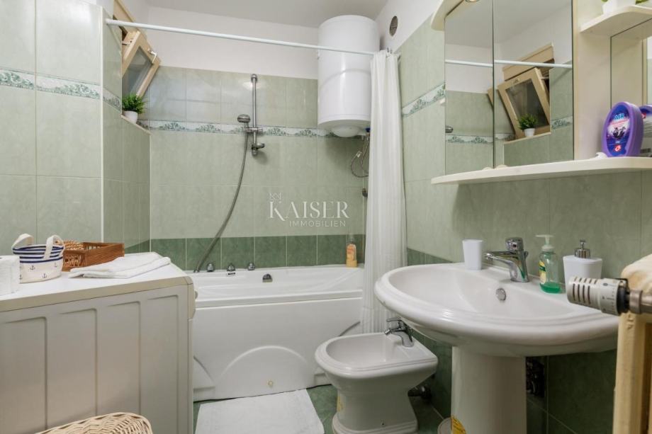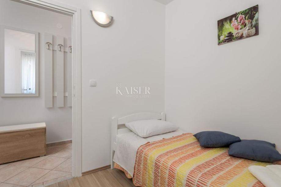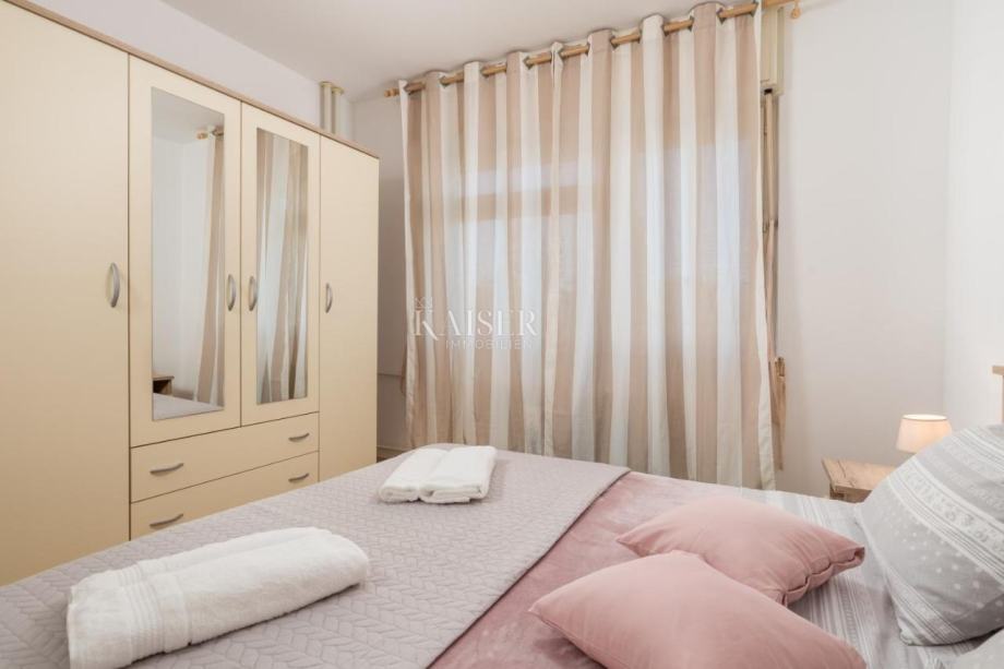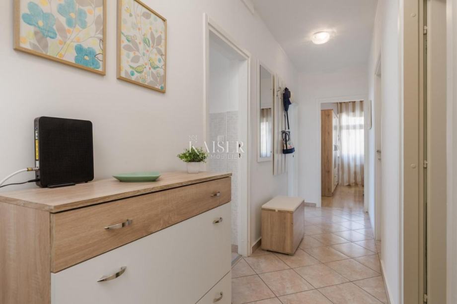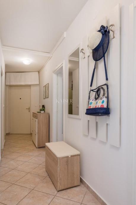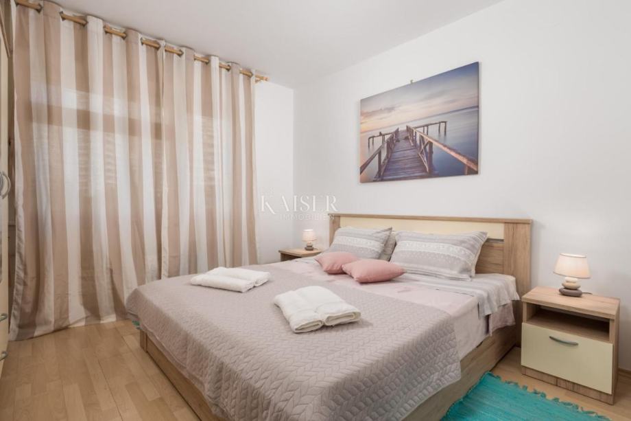 Stan se sastoji od kuhinje s blagovaonom, dnevng boravka okrenutog prema jugu, što omogućava obilje prirodne svjetlosti i predivan pogled na more s balkona. Stan ima veliku kupaonicu i zaseban wc. Stan ima ukupno dvije spavaće sobe od kojih jedna ima izlaz na balkon. Stan ima i drugi prostrani balkon na koji se izlazi iz dnevnog boravka.