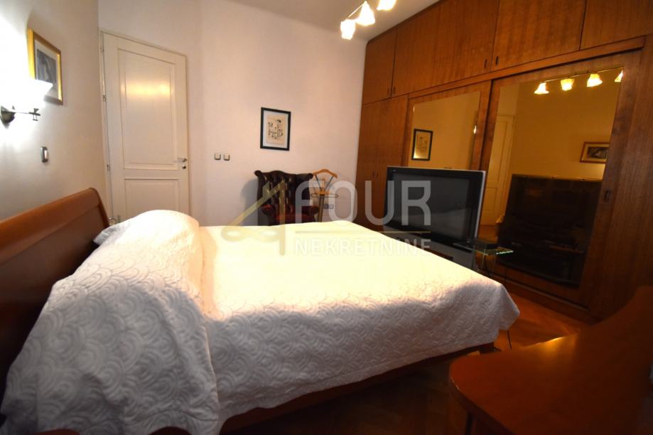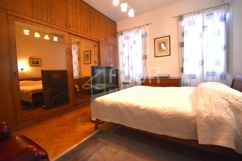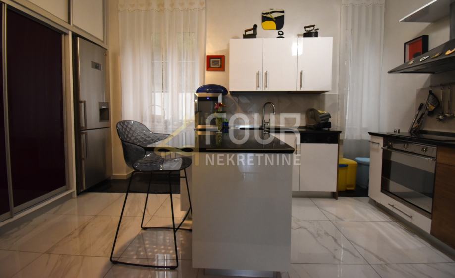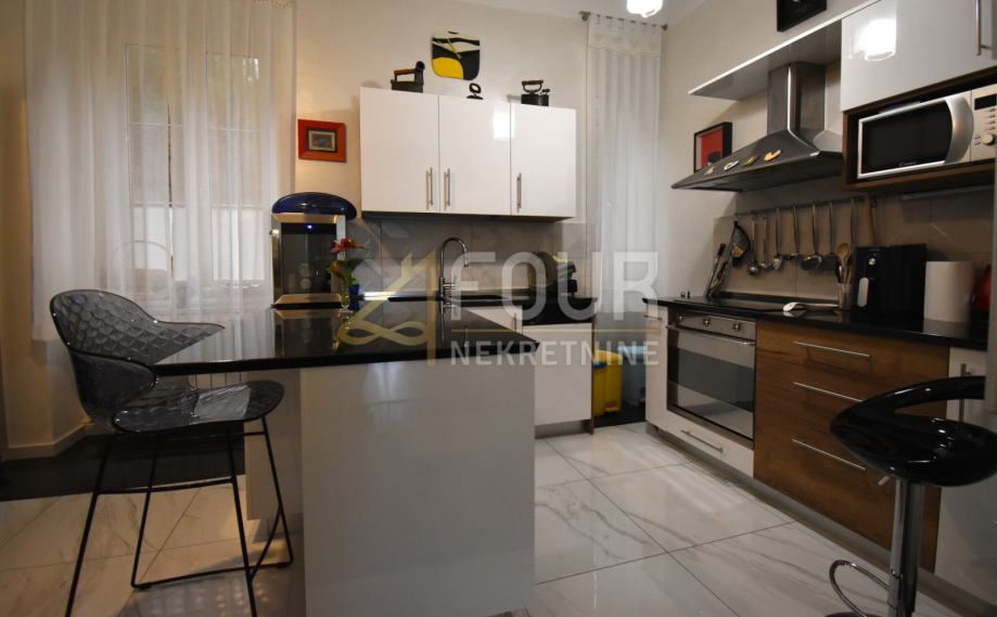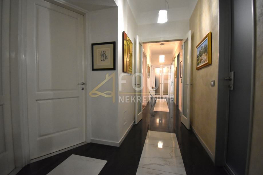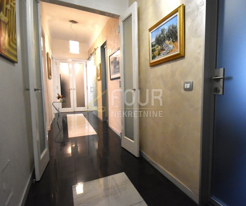 Podovi u sobama su izvrsni hrastovi parketi, dok su ostali podovi obloženi kvalitetnom talijanskom keramikom. Kuhinja je rađena po mjeri s radnom pločom od granita. Tri sobe nude dovoljno prostora za spavanje, rad ili odlaganje, dok prostrana kupaonica, zaseban toalet i praonica dodatno podižu funkcionalnost stana.