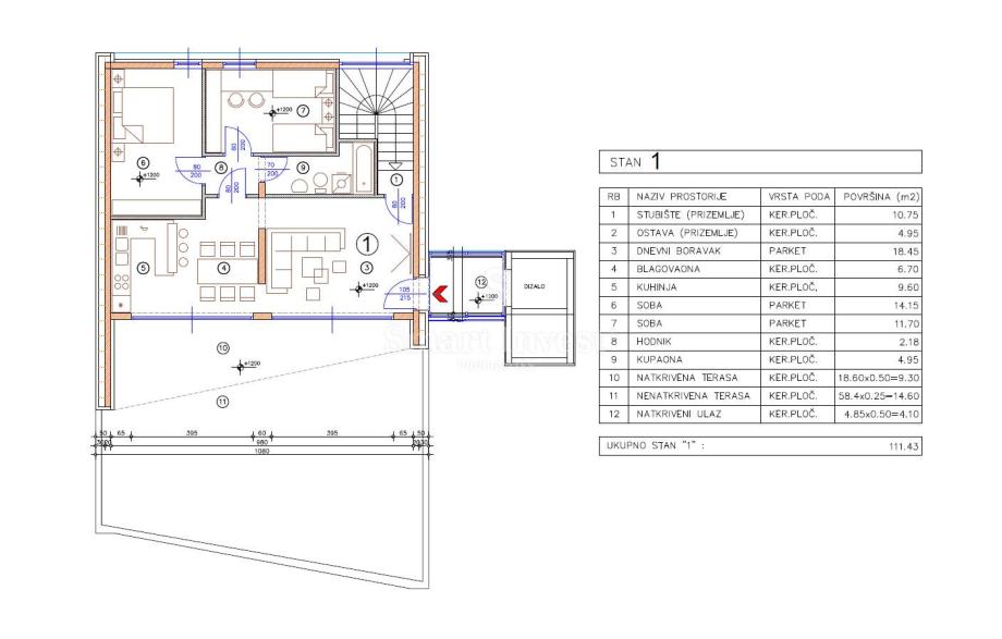 STAN S1, 2S+DB – ukupne neto površine 111.43 m2 - nalazi se na visini 4. kata s južne strane (od strane ulaza visina 1.kata)