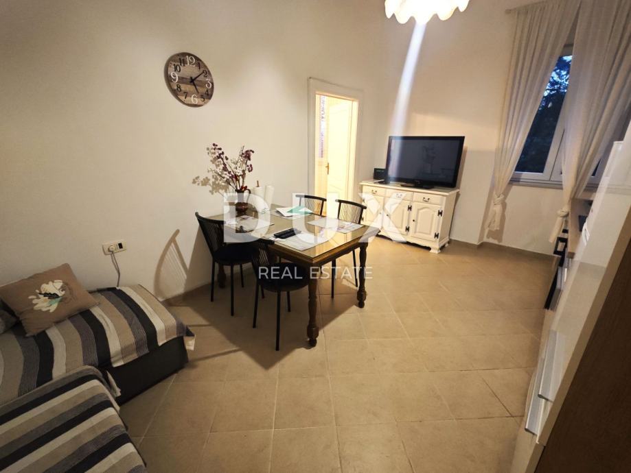 Sastoji se od dvije spavaće sobe, dnevnog boravka s kuhinjom, hodnika i kupatila. Kompletno je orijentiran na jug. Adaptiran i kao takav se prodaje. Pripada mu drvarnica u suterenu zgrade. Blizina svih sadržaja. Grijanje na struju (klime i radijatori). Korišten u svrhu najma.