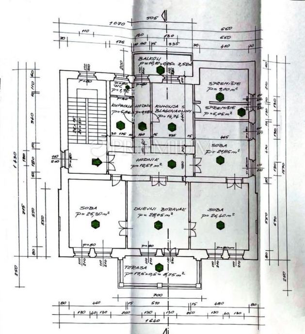 Stan se prostire preko cijele druge etaže prekrasne povijesne vile, te ima netto površinu od 172 m2.