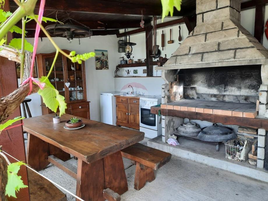 Ispred kuće se nalazi predivna okućnica sa ljetnom sjenicom, dvije konobe i tri garaže.