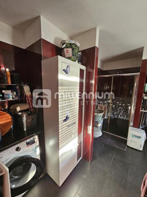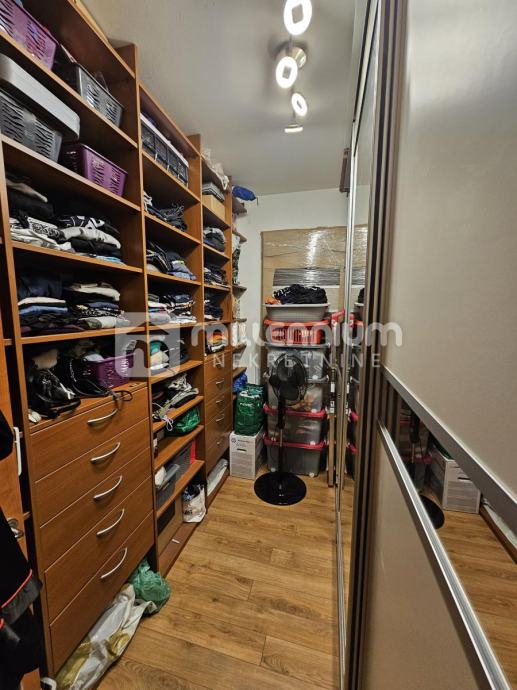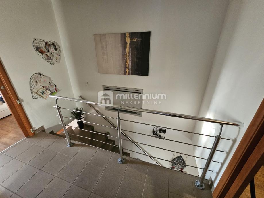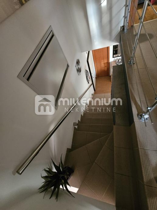 Rasporedom je trosobni s dnevnim boravkom površine 110.30m2. Na donjoj etaži nalazi se veliki dnevni boravak s kuhinjom i blagovaonicom i lođom, toalet i spremište ispod stepenica, a na drugoj etaži su tri spavaće sobe i velika kupaonica s još jednom lođom. Prodaje se nenamješten.