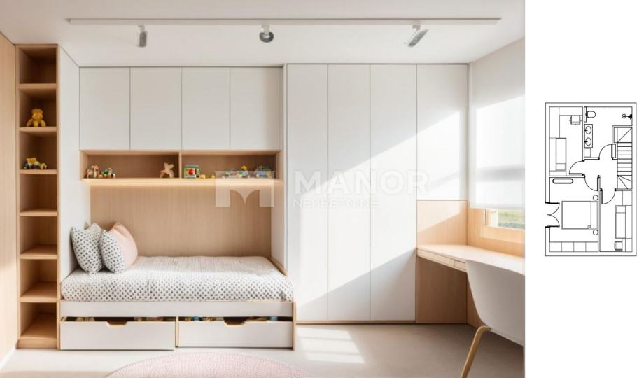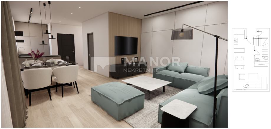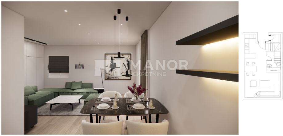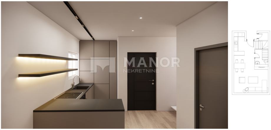 Manor predstavlja dvoetažni stan u izgradnji, smješten na području Škurinja, stambene površine 98 m².