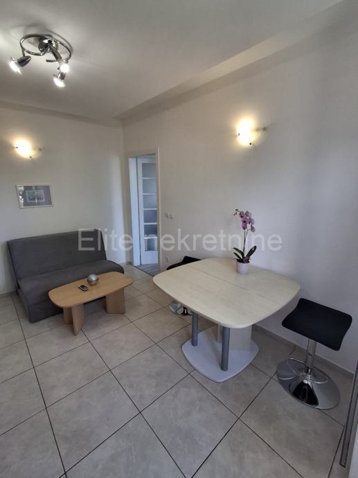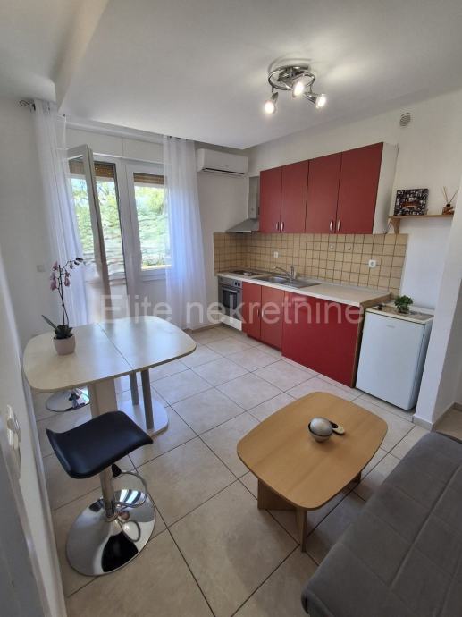 Stan je u stambenoj zgradi na 3.katu, a zgrada ima 4 kata. U blizini besplatni javni parking.Orijentacija stana je jugozapad, pa je sunčan, prozračan i suh, smješten između stanova, tako da je vanjski zid samo na pročelju zgrade.Vrlo niske režije ( oko 50e).Sastoji se od hodnika, kupaone, kuhinje i dnevnog boravka zajedno, velike spavaće sobe i balkona , te drvarnice.Ukupna površina je 34,94m2, a bruto površina je 42 m2.