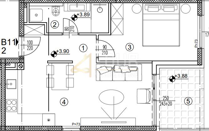 Ponuđeni stan na prvom katu, ukupne stambene površine 60.28 m², sastoji se od hodnika/garderobe, spavaće sobe, kuhinje s blagovaonicom, dnevnog boravka s izlazom na lođu površine 6.34 m², kupaonice, terase od 32.45m2, ostave te garažnog mjesta, a orijentiran je prema jugu, sjeveru i istoku.