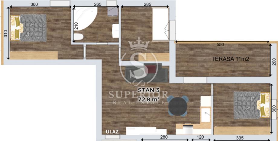 Stan ima stambenu površinu od 73 m2 te se sastoji od hodnika, kuhinje s blagovaonicom i dnevnim boravkom, tri spavaće sobe, kupaonice i terase površine 11 m2. Prostor je funkcionalno osmišljen, s naglaskom na udobnost i kvalitetan raspored.