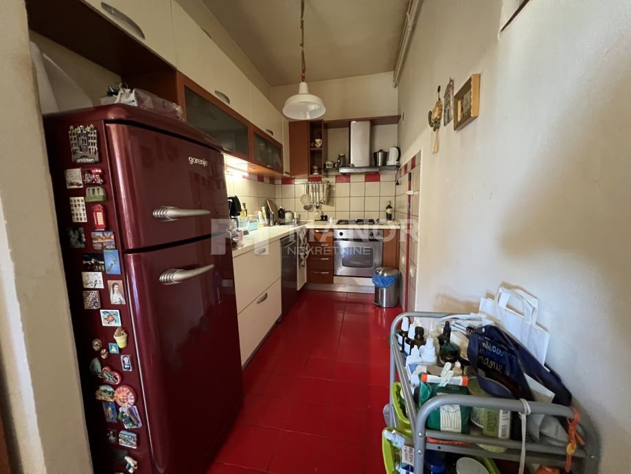 Trsatu. Stan se sastoji od hodnika, kuhinje s blagovaonicom i dnevnim boravkom, tri spavaće sobe i kupaonice.