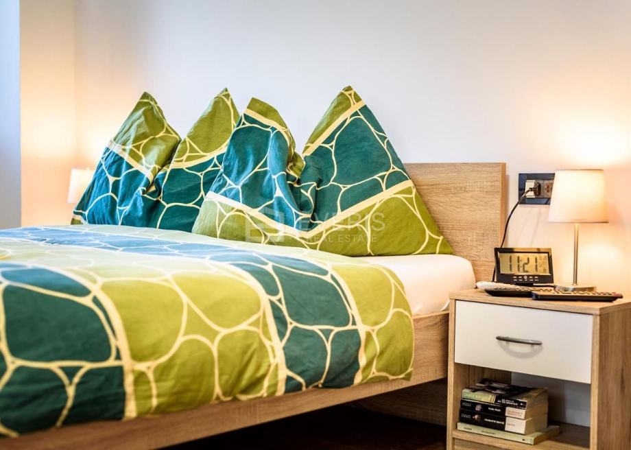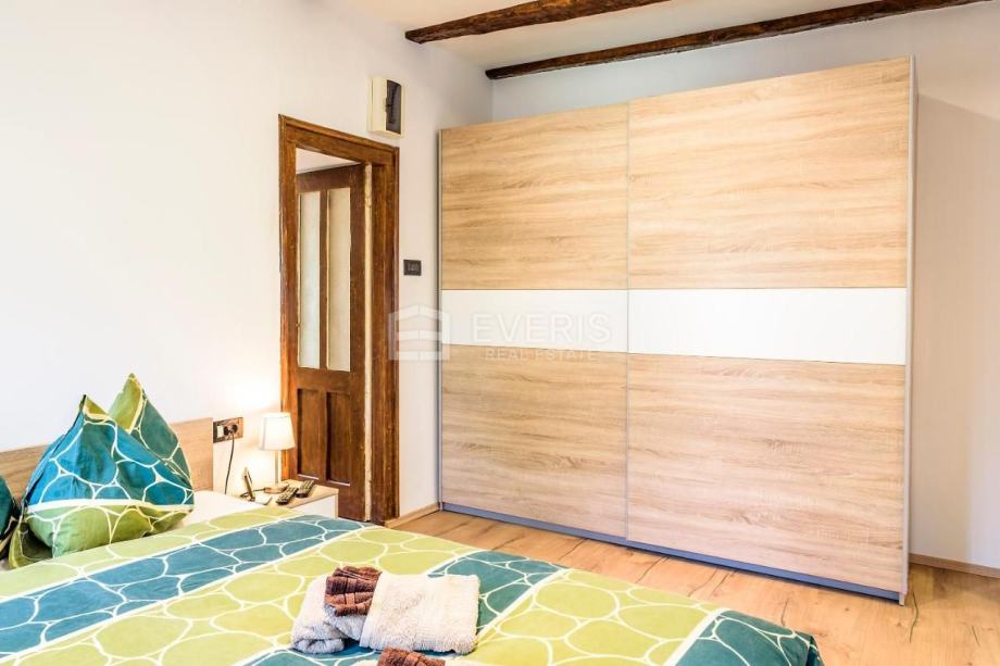 Potpuno renoviran udoban apartman s jednom spavaćom sobom s blagovaonicom i prostranom kuhinjom s opremljenom pećnicom, hladnjakom, perilicom posuđa, perilicom rublja i setom za kuhanje.