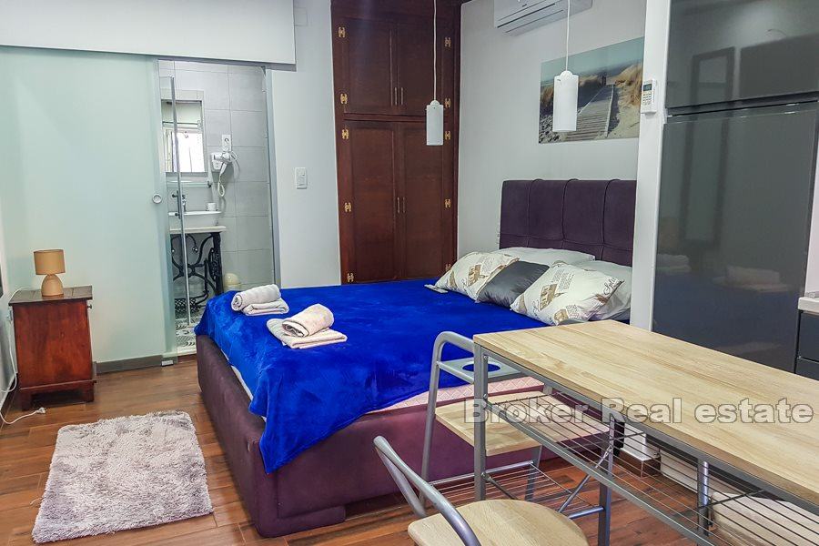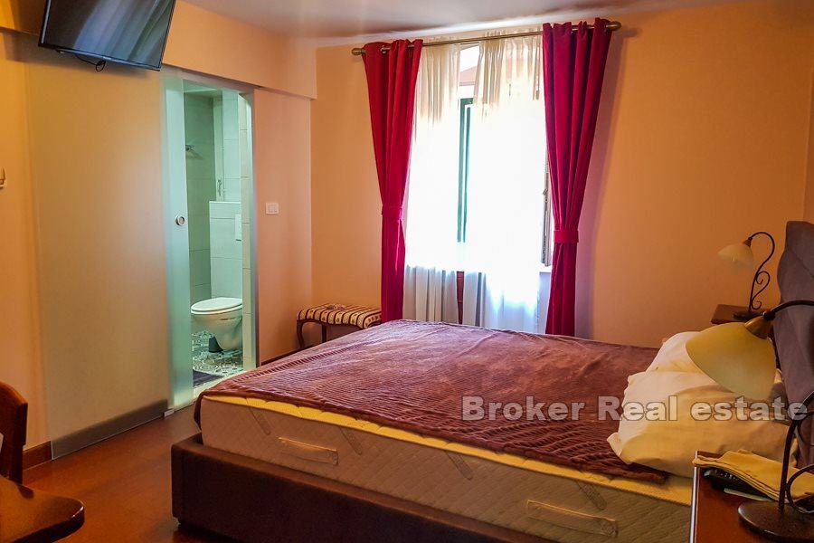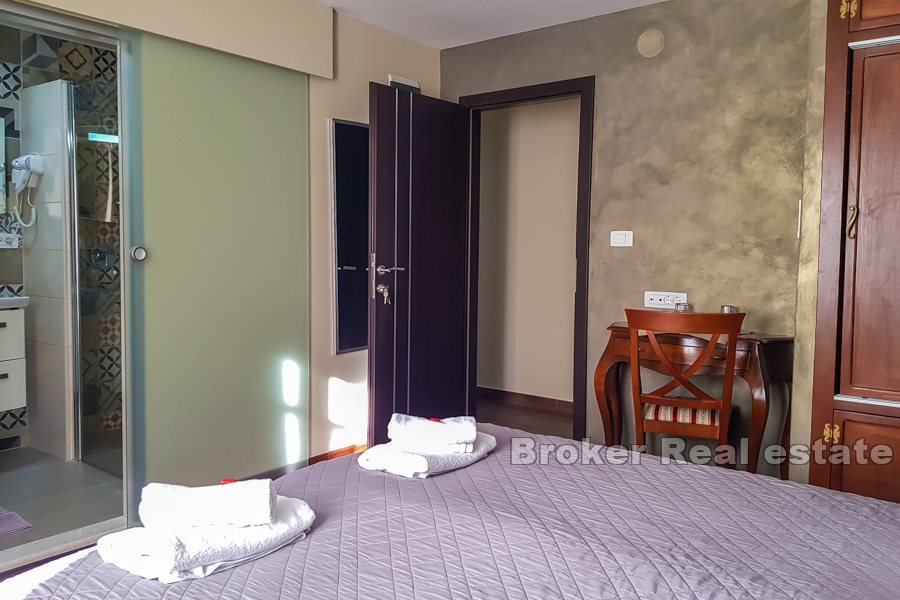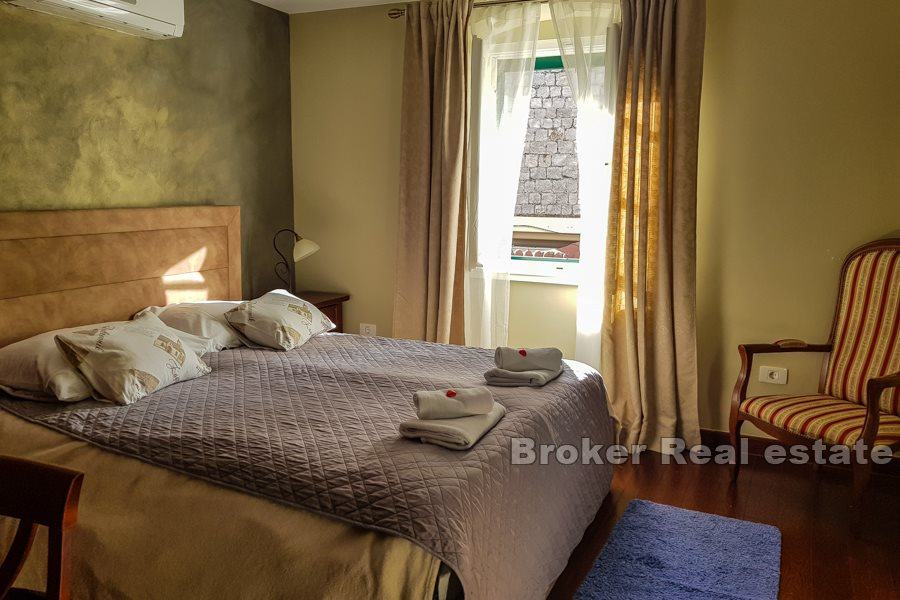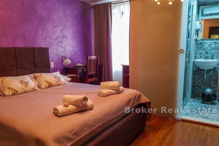 U centru grada Splita, nadomak splitske rive, na prvoj etaži renovirane kamene kuće smještena je ova izvanredna nekretnina. Do kuće se dolazi s jedne od glavnih ulica u centru, kroz veliko unutrašnje dvorište kuće. Kat površine cca.160 m2 se sastoji od ulaznog dijela s recepcijom, pet luksuznih soba s kupaonicama te dva velika hodnika. Sobe su uređene u autohtonom, klasičnom stilu, a većina namještaja izrađena je ručno i to od skupocjenog, punog drveta, dok su za kupaonice birane najkvalitetnije sanitarije. Tri istočne sobe imaju lijepi pogled na unutrašnje dvorište kuće, zelenilo te na ulicu.