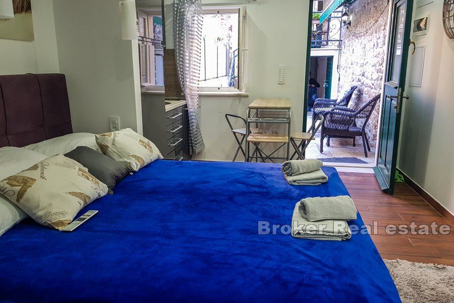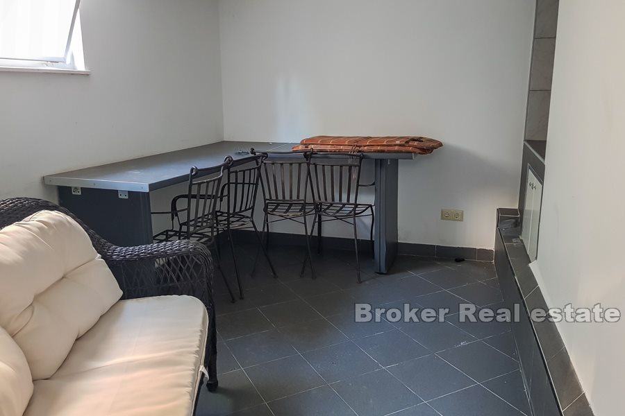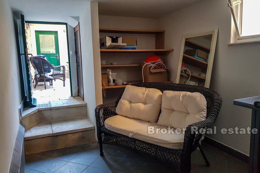 Kroz stražnji izlaz dolazi se na veliku natkrivenu terasu sa stolovima i stolicama koja sada služi za boravak gostiju preko dana. S terase se silazi u drugi dio dvorišta u kojemu se nalazi odvojeni studio apartman, također potpuno renoviran. Apartman se sastoji od jednog prostora u kojemu su kuhinja i spavaća soba te od kupaonice. Preko puta apartmana, a u suterenu kuće nalazi se veća prostorija s ostavom od cca. 15 m2 koja ima postavljene instalacije za vodu i struju te se lako može prenamijeniti u konobu, za što je ovaj prostor originalno zamišljen od strane trenutnih vlasnika. Površina vanjskog dijela, dakle vanjskog dvorišta s terasom i studio apartmanom iznosi 82 m2, dok je površina samog apartmana cca 20 m2.