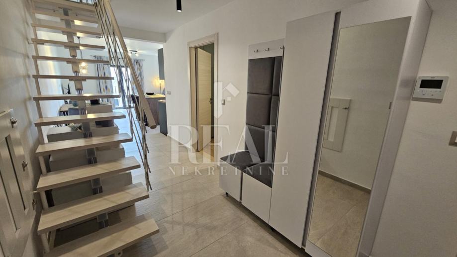 Stan koji se prodaje se nalazi na 2.katu i proteže se kroz dvije etaže koji se sastoji od otvorenog prostora dnevnog boravka kuhinje sa izlazom na balkon, kupaonica ,manja dječja soba te veća spavaća soba.