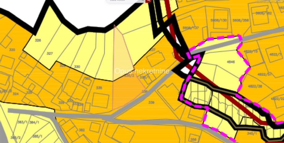 - Prednji dio zemljišta cca 417 m2 pripada tamno žutoj boji - izgrađeni dio građevinskog zemljišta, dok ostatak, cca 366 m2 priprada svjetlo žutoj boji - neizgrađeni dio građevinskog zemljišta. Dozvoljeno graditi prizemlje i 2 etaže. Izgrađenost 40%.