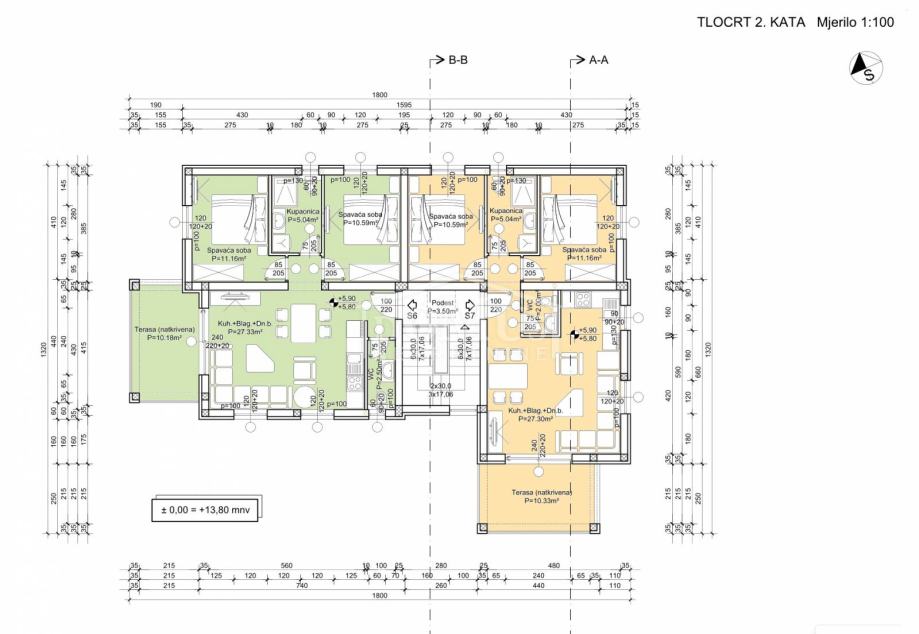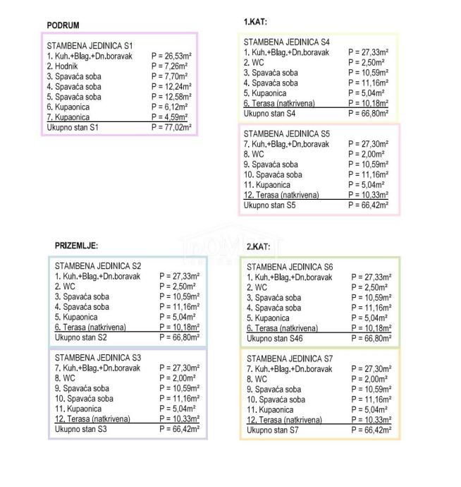 STAMBENA JEDINICA S6, nalazi se na 2.katu, ima sveukupnu korisnu površinu od 66,80m2, orijentirana je na jugozapadnu stranu, sastoji se od dnevnog boravka, kuhinje i blagovaonice, dvije spavaće sobe, kupaonice, toalet, te natkrivene terasa površine 10,18m2. Stanu pripada jedno parkirno mjesto te jedno spremište.