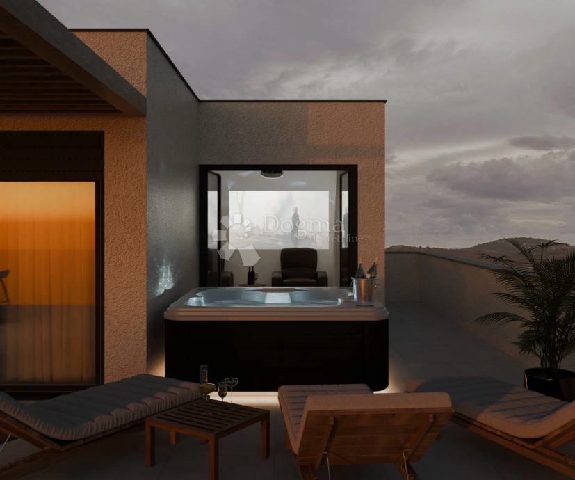 Užitak boravka pod nebom počinje s izlazom na krovnu terasu i ističe se prekrasnim pogledom na more i okolne krajeve, pružajući nezaboravne trenutke uživanja ispod pergole uz vanjski šank, hidromasažnu kadu i veliko kino platno.
