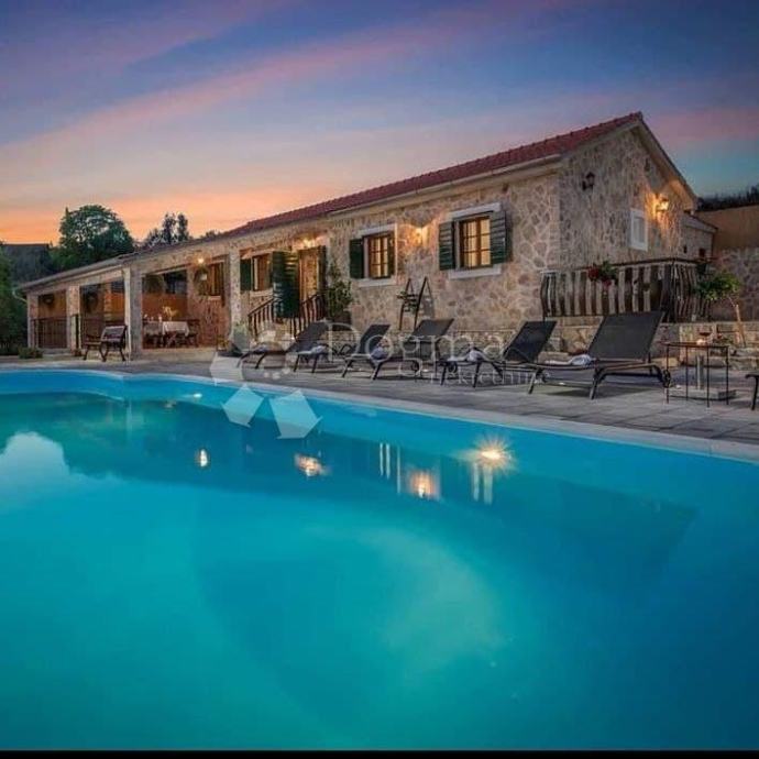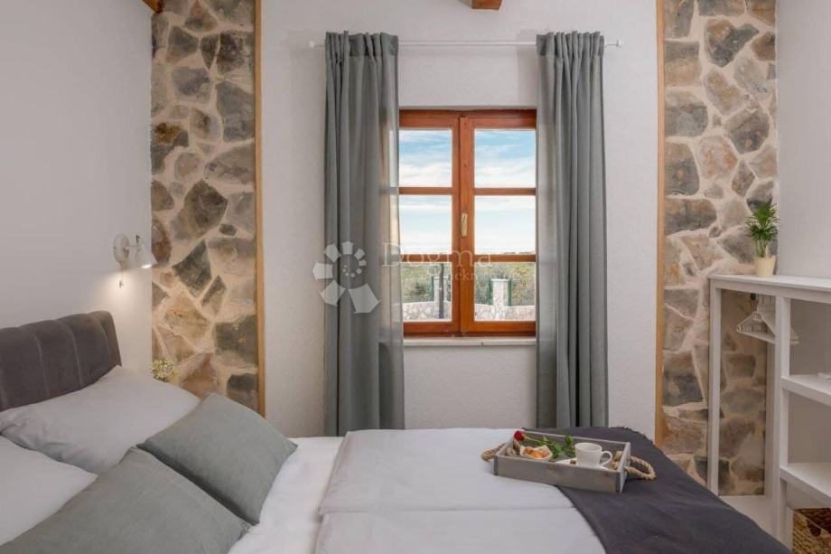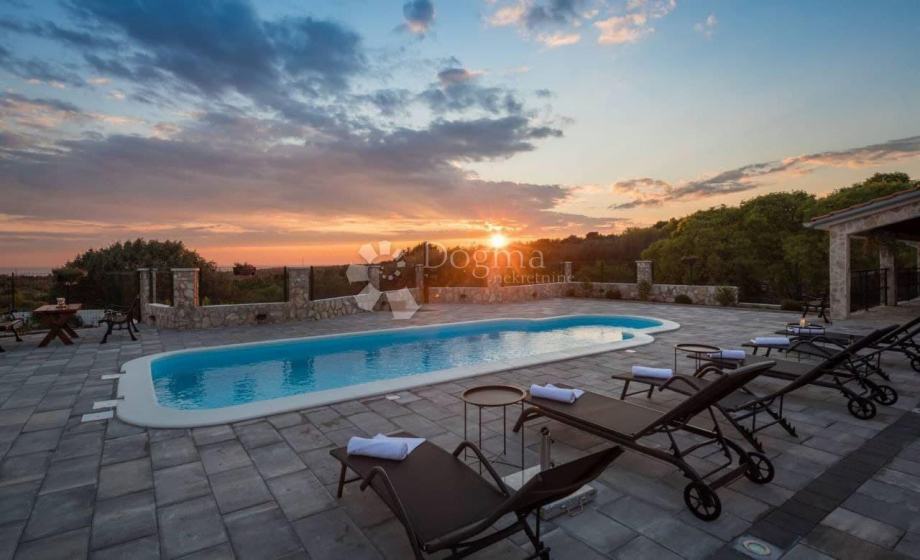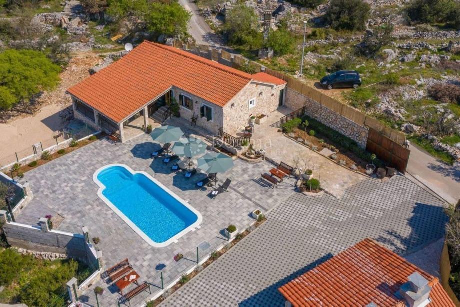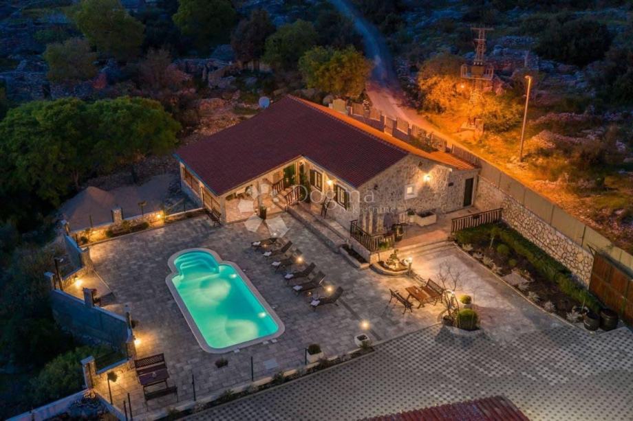 Prekrasna kamena vila s bazenom u zaleđu Rogoznice s panoramskim pogledom na more.