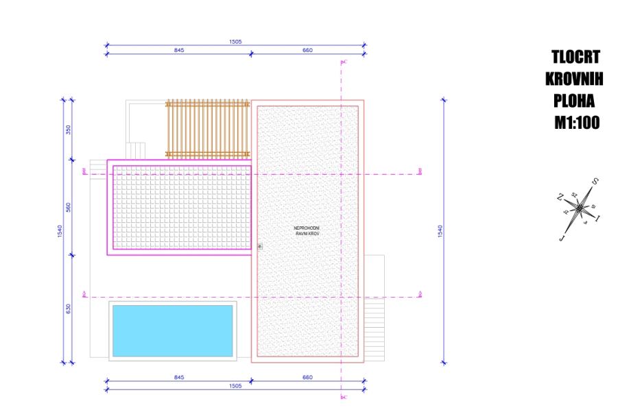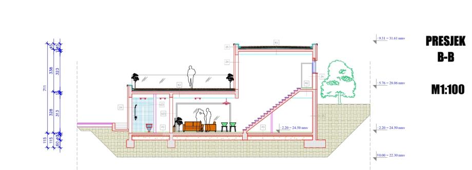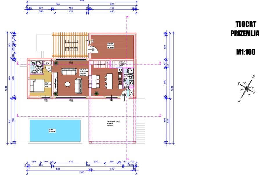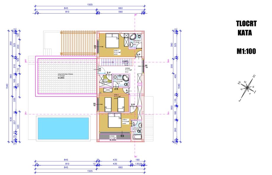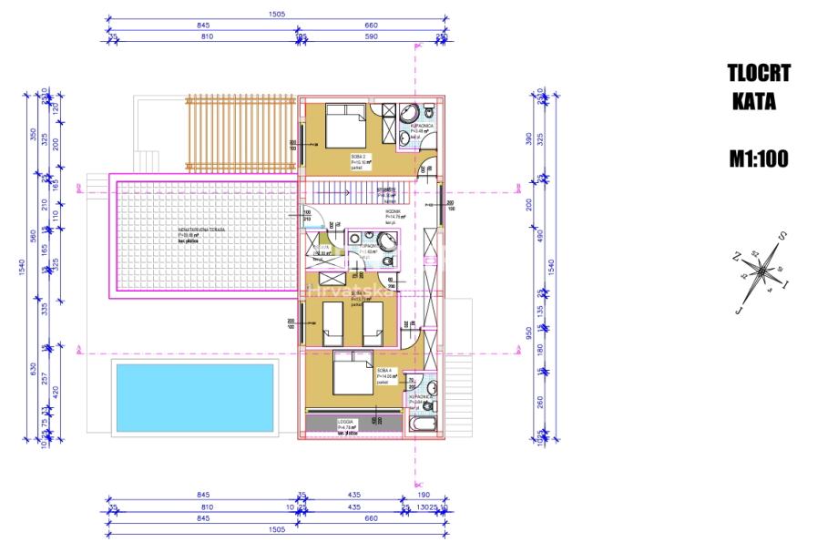 Vanjskim stepeništem dospijevate do natkrivene terase (40m2) i nenatkrivene terase (60m2) na kojoj je smješten bazen veličine 20m2.
