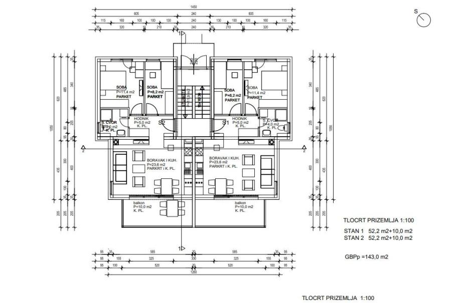 Stan S1-2 nalazi se u prizemlju moderne stambene zgrade i ističe se funkcionalnim rasporedom te prostranim vanjskim prostorima. Neto korisna površina 59,10 m².