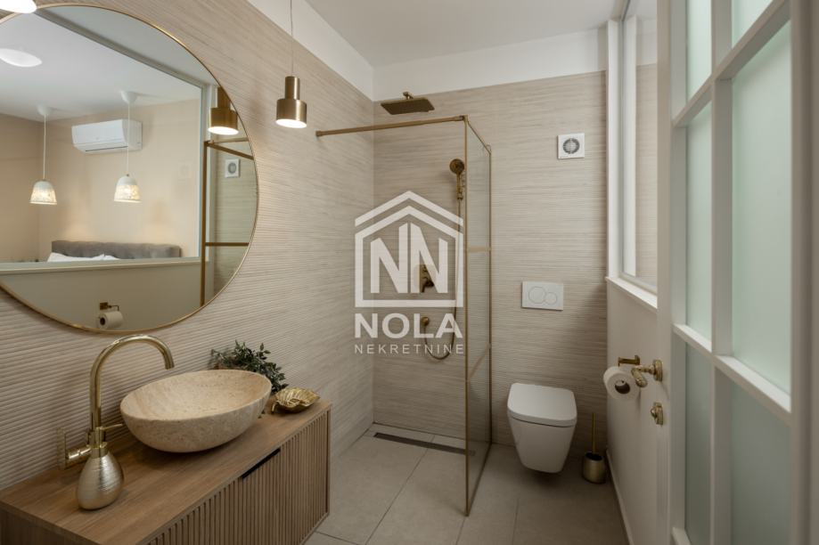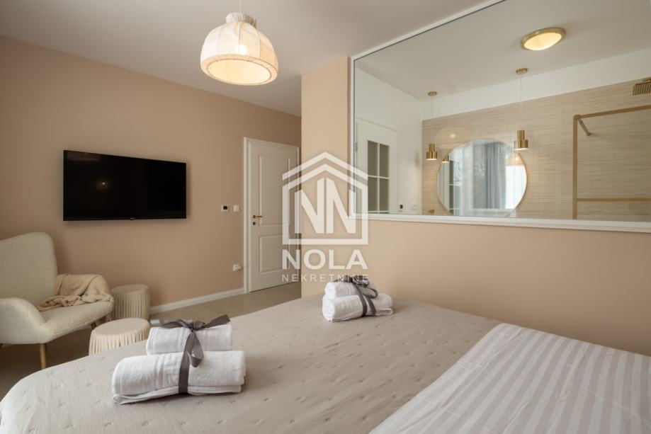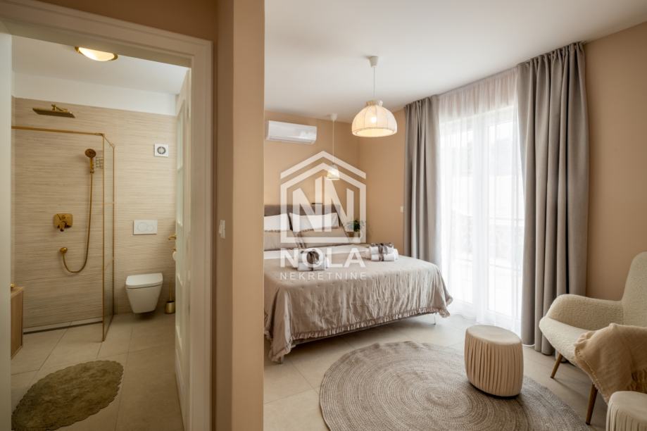Već pri samom ulasku u villu, dočekaju vas prozračni i svijetli prostori koji odišu elegancijom i luksuzom. Prizemlje je osmišljeno u konceptu otvorenog prostora, s moderno opremljenom kuhinjom, blagovaonicom i prostranim dnevnim boravkom koji zajedno čine središte doma. Glavna spavaća soba, smještena u prizemlju, opremljena je vlastitom kupaonicom, pružajući dodatnu udobnost i privatnost.