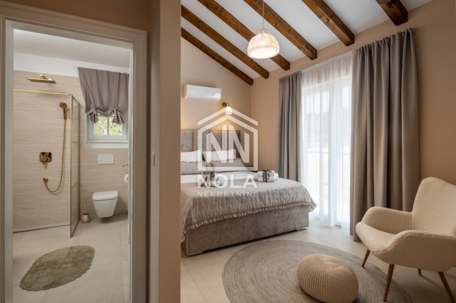 Unutarnje stepenice vode na gornju etažu gdje su smještene tri dodatne spavaće sobe. Svaka soba ima vlastitu kupaonicu, osiguravajući potpunu udobnost za sve ukućane i goste. Najveća spavaća soba na ovoj etaži ima izlaz na prostranu terasu, s koje se pruža zadivljujući pogled na more.