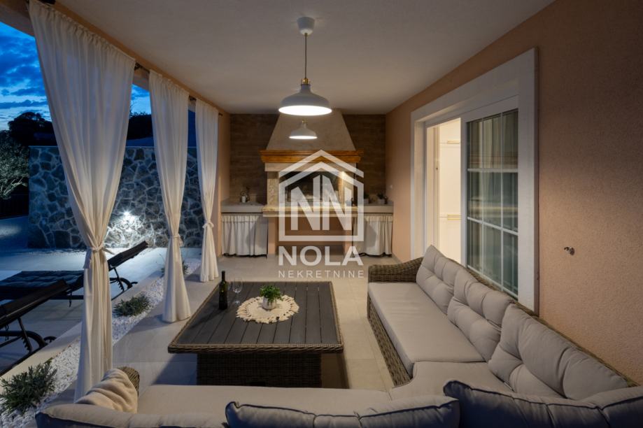Vanjski prostor ove ville osmišljen je kao prava oaza za opuštanje i uživanje na otvorenom. Prostrani bazen nudi osvježenje tijekom toplih ljetnih dana, dok vanjski kamin stvara savršeno mjesto za ugodne večeri s obitelji i prijateljima. Uređeni prostor za blagovanje na otvorenom opremljen je stolovima i stolicama, idealan za uživanje u objedu uz zvukove prirode.