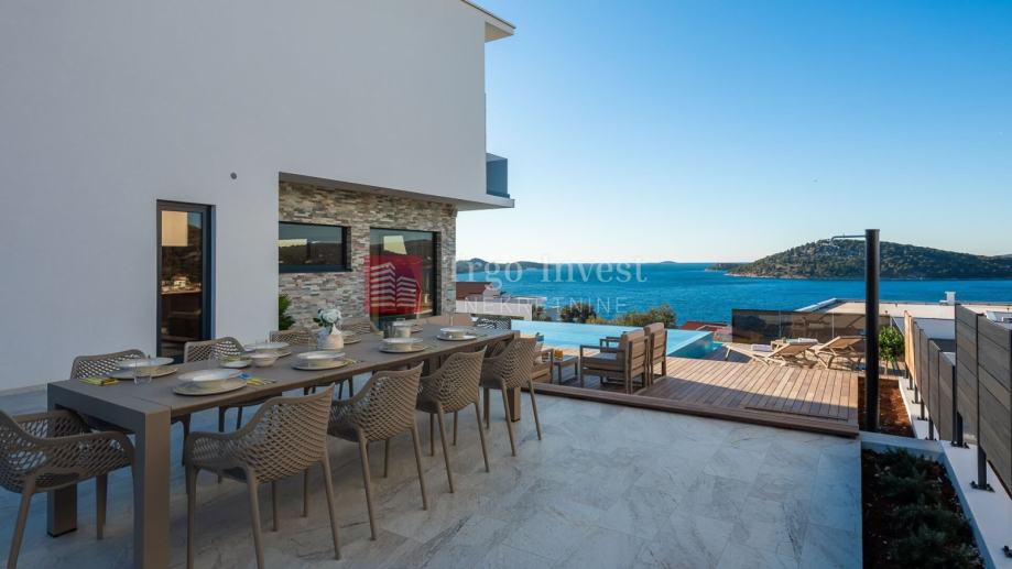 RAŽANJ (ROGOZNICA) - moderna novoizgrađena luksuzna vila stambene površine 260 m2, na parceli od 660 m2, kompletno je opremljena modernim dizajnerskim namještajem i vrhunskim uređajima. Građena je vrhunskim materijalima koji su pažljivo birani i dizajnirani kako bi zadovoljili visoke standarde življenja. Samo neke pogodnosti koje nudi ova vila je: sauna, wellnes, fitness, infinity bazen, komociju i prostranost svih prostorija u vili sa ugodnim pogledom na more.
